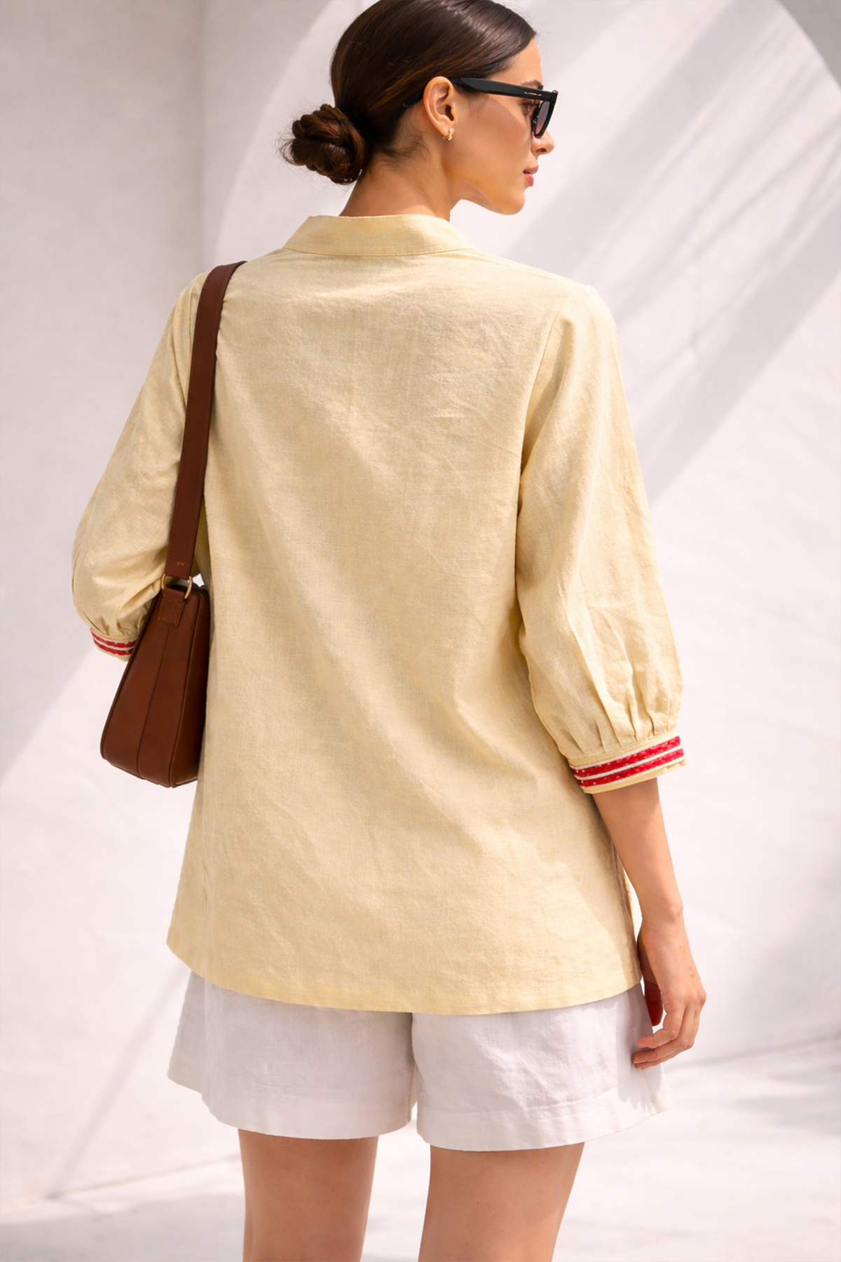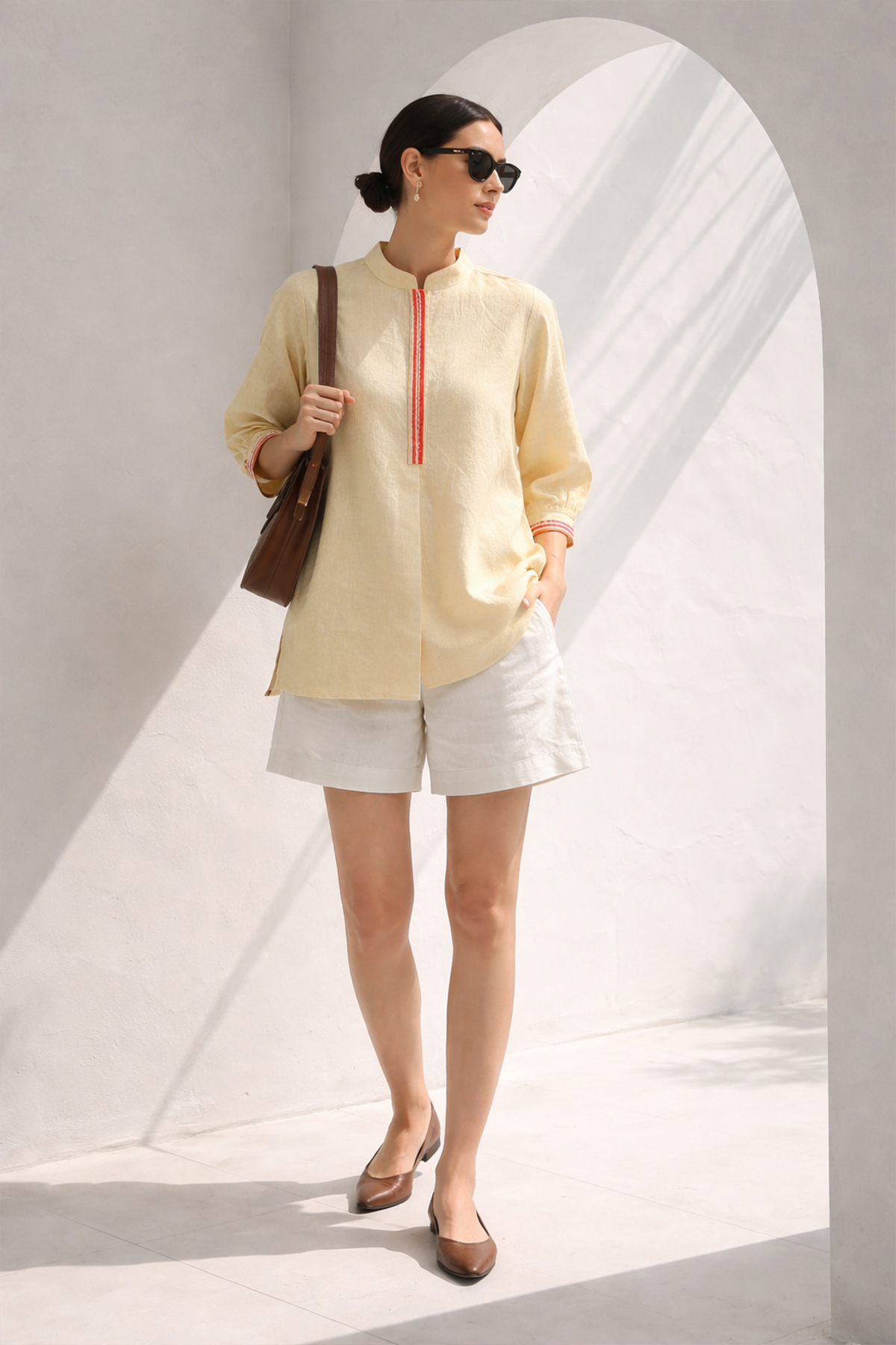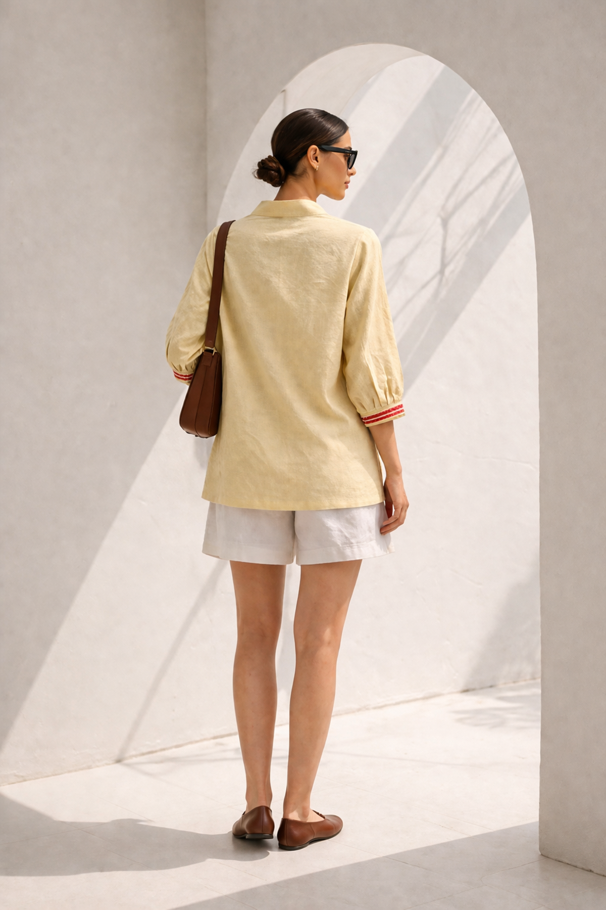 A perfect blend of comfort and charm, this yellow cotton flex top is designed for easy, everyday wear. It features a relaxed fit with a clean silhouette, elevated by subtle red detailing on the neckline and sleeves for a refined touch.