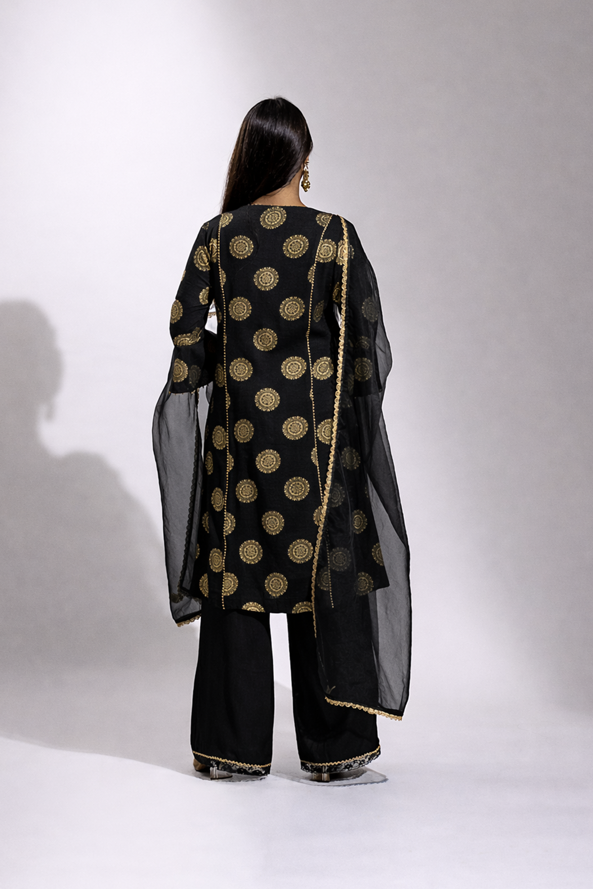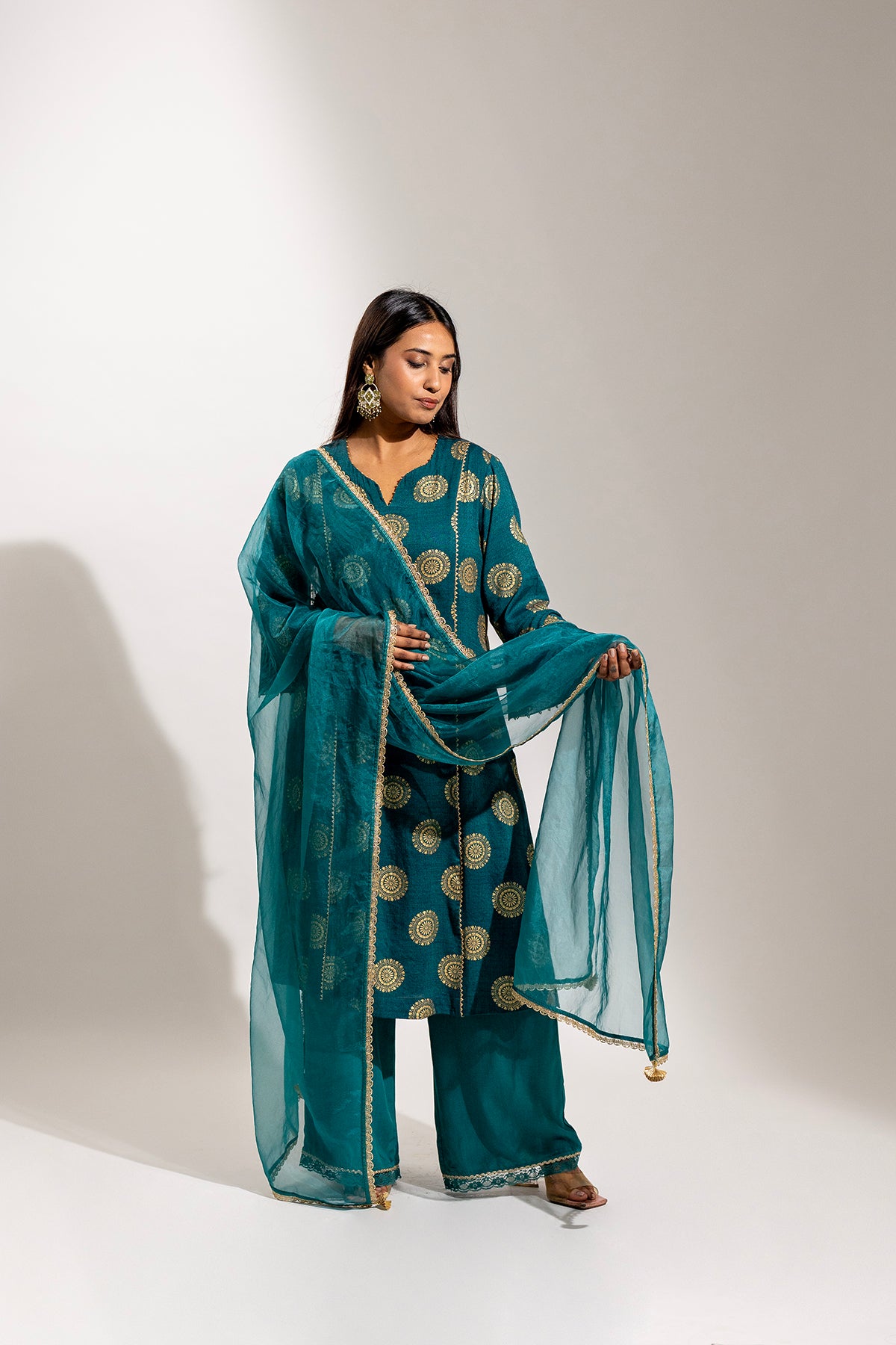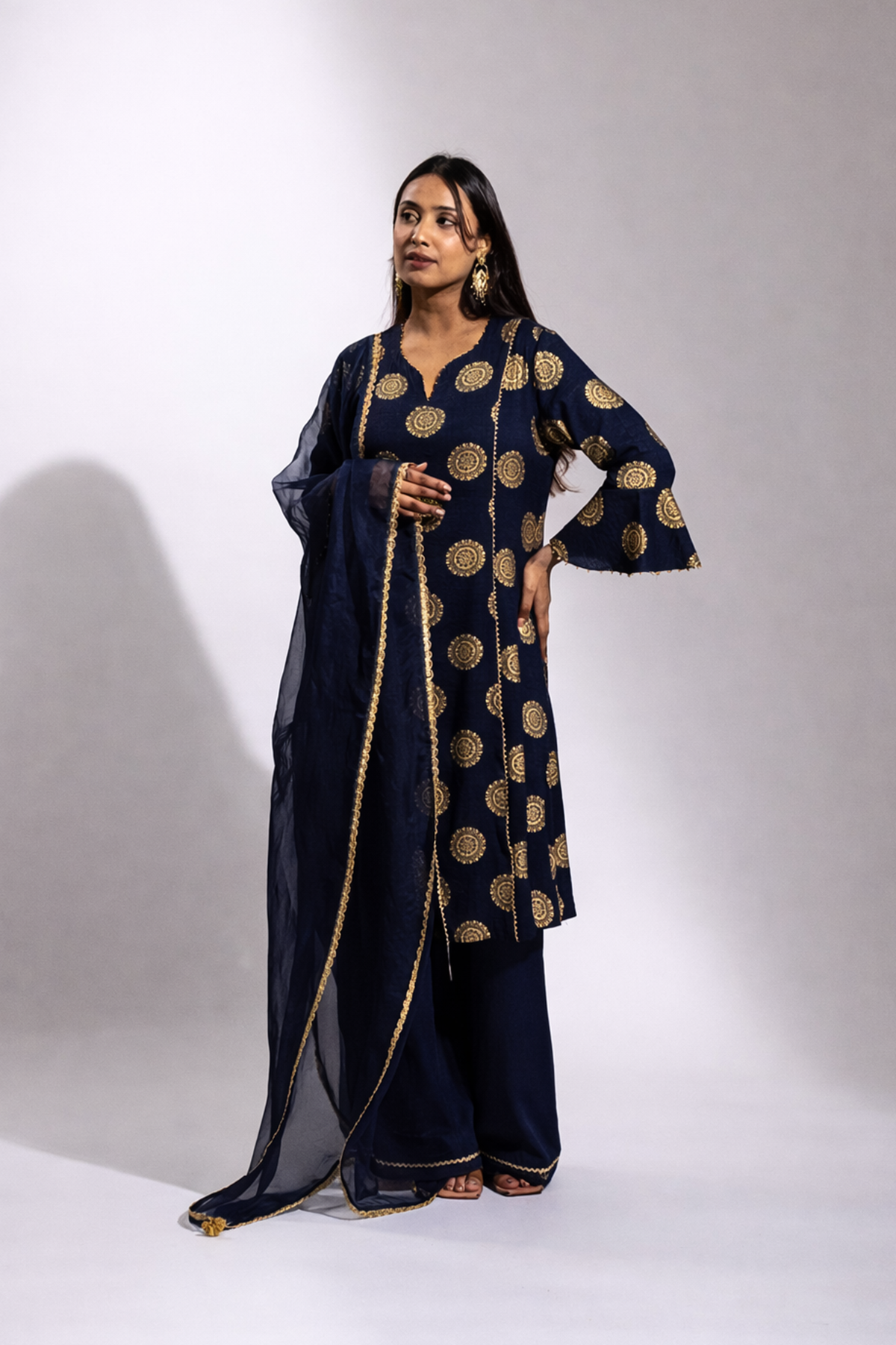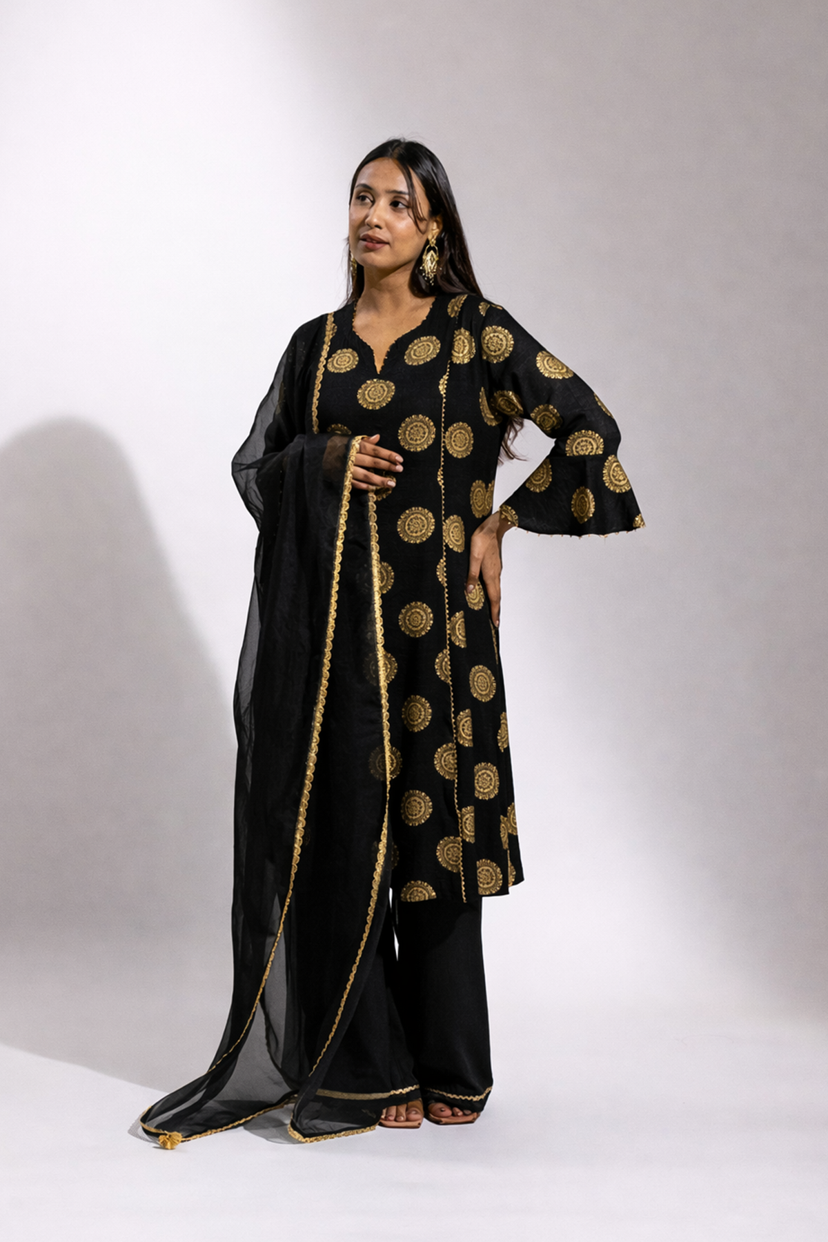 A graceful ensemble crafted in soft rayon, featuring a gold printed long kurta paired with a comfortable palazzo. The look is beautifully finished with a sheer organza dupatta adorned with delicate gold painted detailing, adding a refined festive charm.