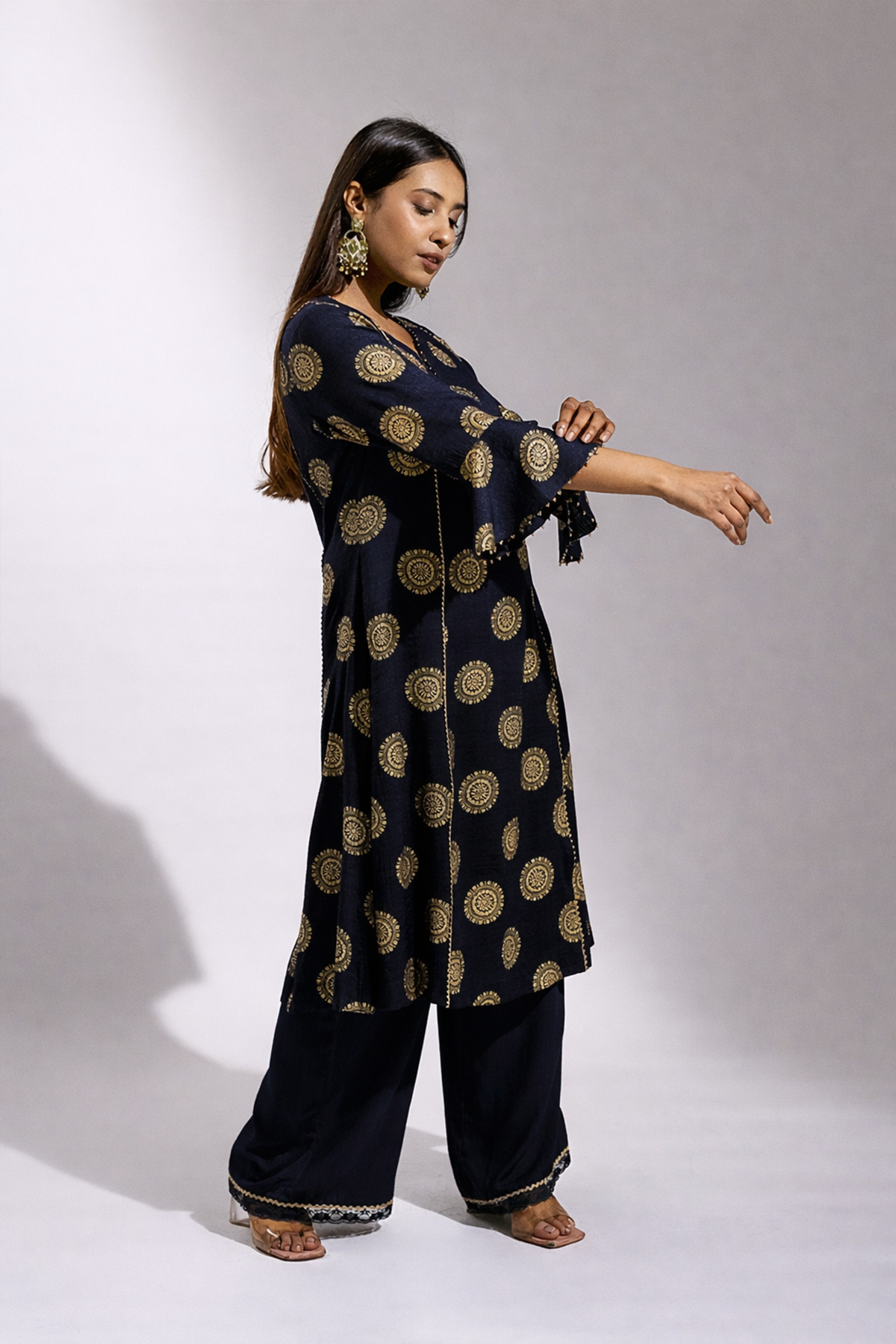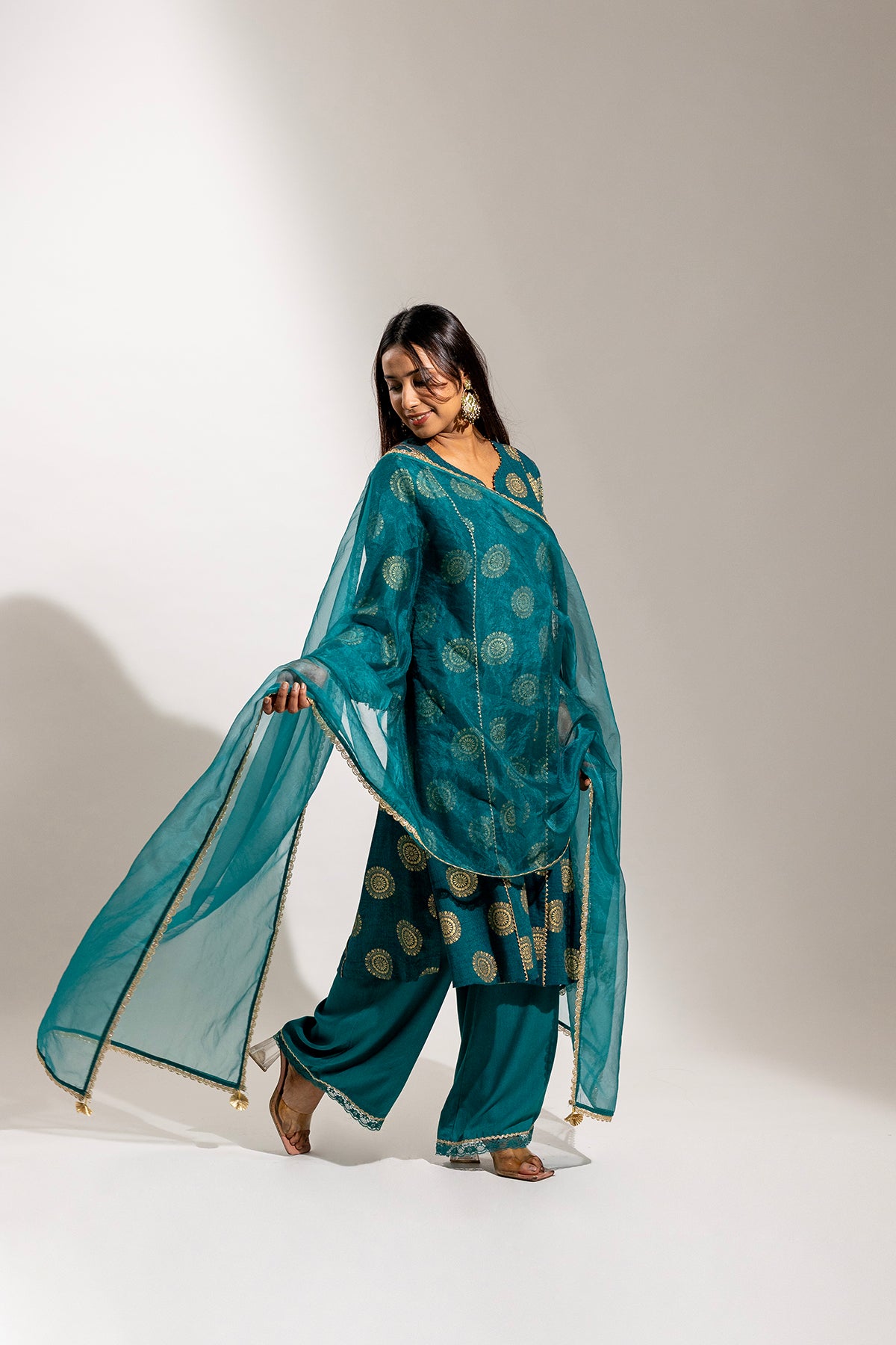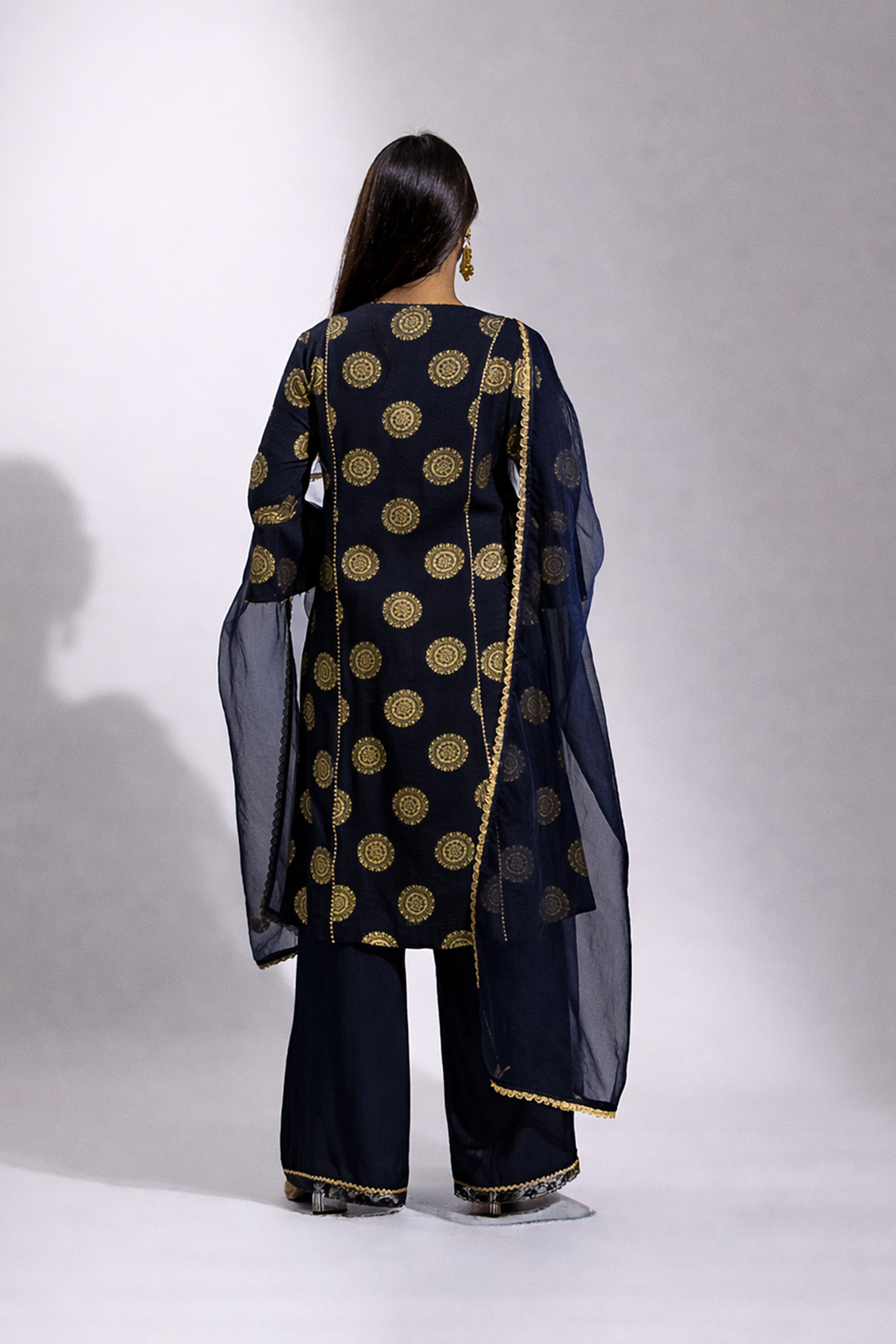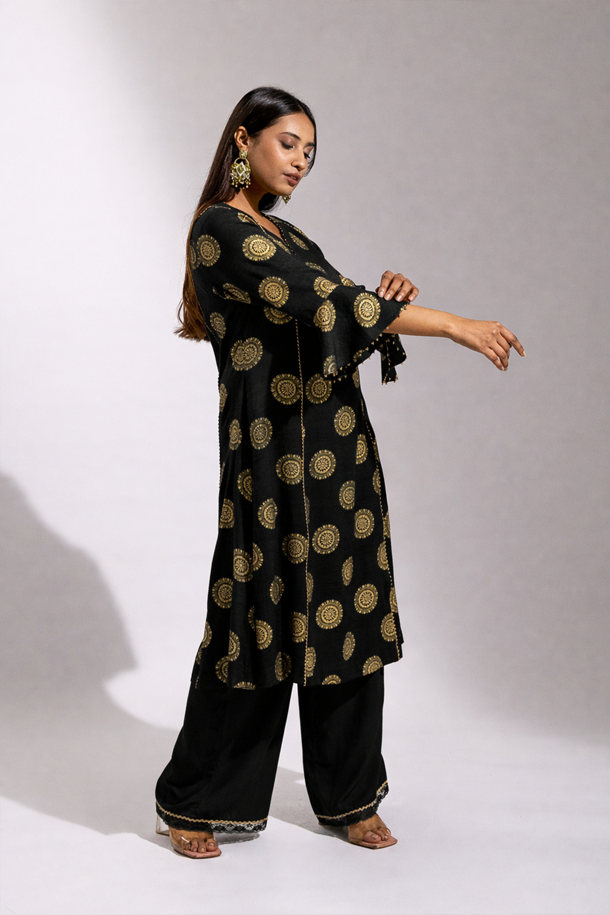 A graceful ensemble crafted in soft rayon, featuring a gold printed long kurta paired with a comfortable palazzo. The look is beautifully finished with a sheer organza dupatta adorned with delicate gold painted detailing, adding a refined festive charm.
