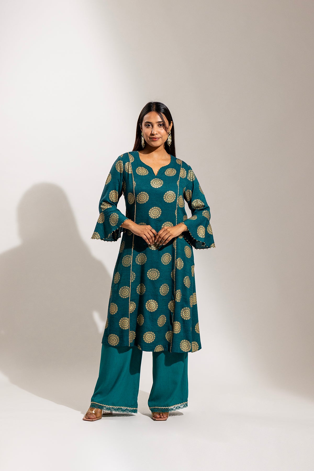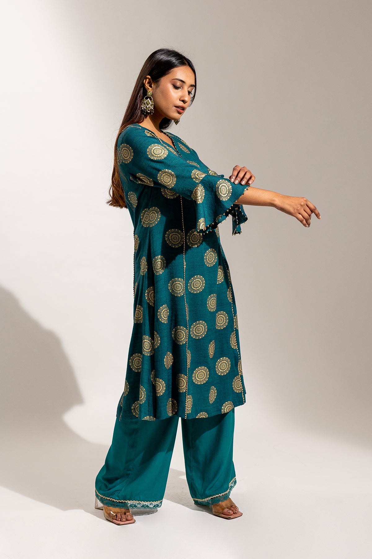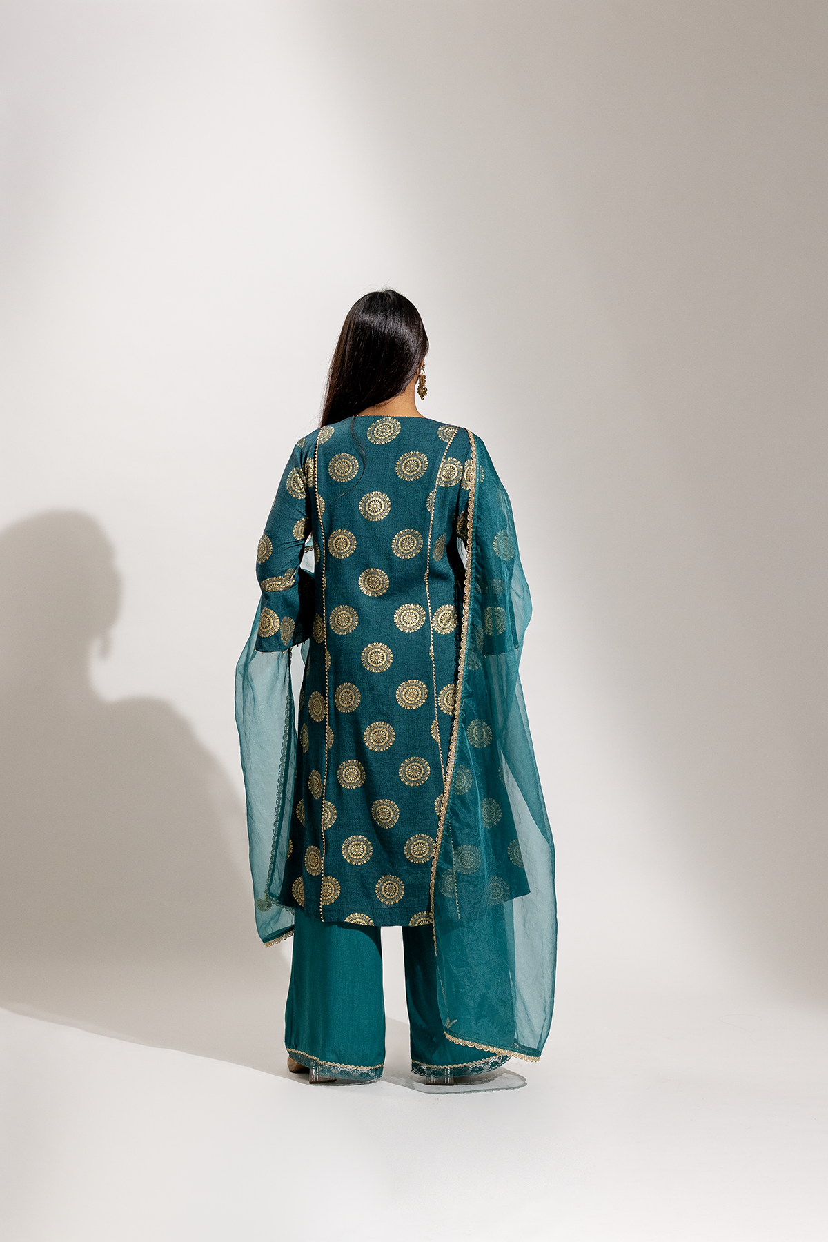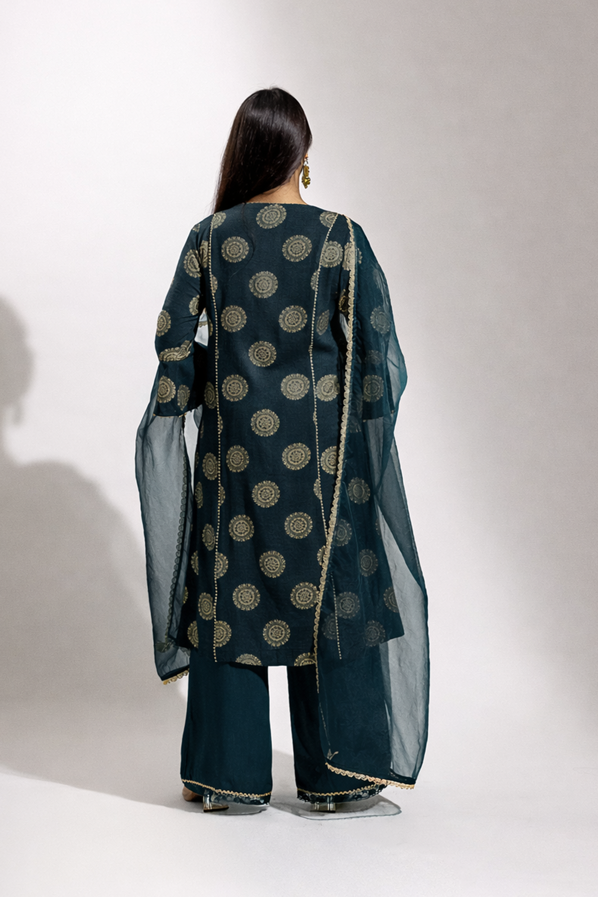 A graceful ensemble crafted in soft rayon, featuring a gold printed long kurta paired with a comfortable palazzo. The look is beautifully finished with a sheer organza dupatta adorned with delicate gold painted detailing, adding a refined festive charm.