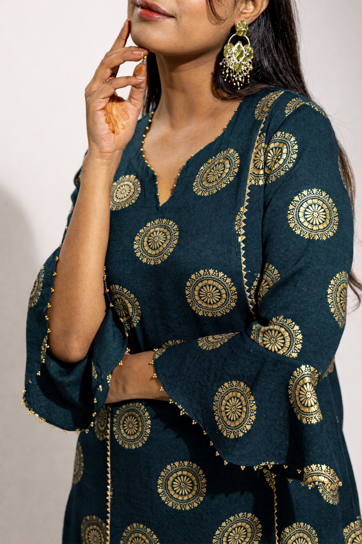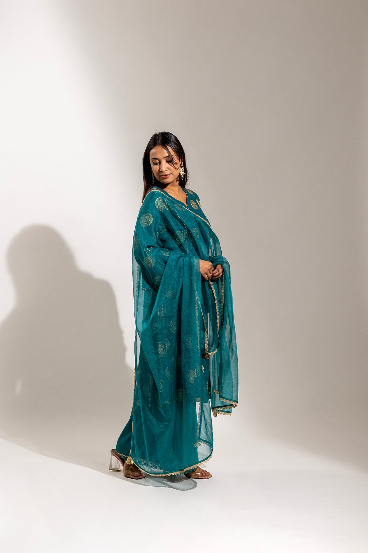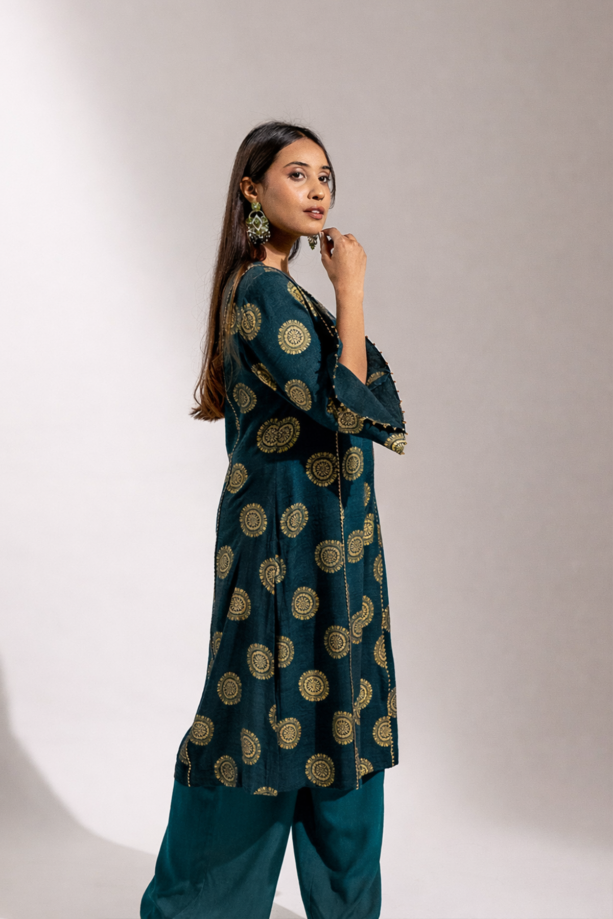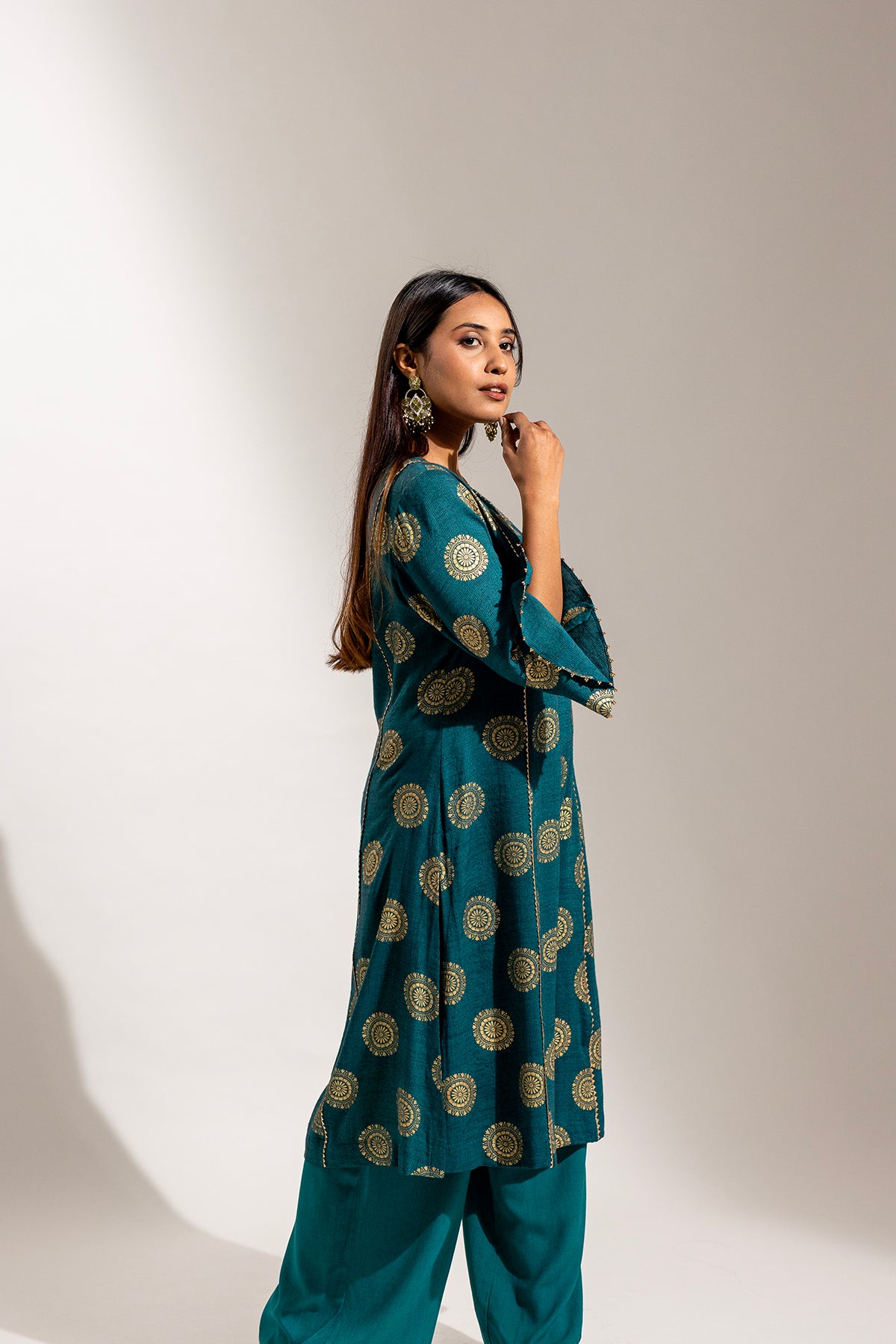 A graceful ensemble crafted in soft rayon, featuring a gold printed long kurta paired with a comfortable palazzo. The look is beautifully finished with a sheer organza dupatta adorned with delicate gold painted detailing, adding a refined festive charm.